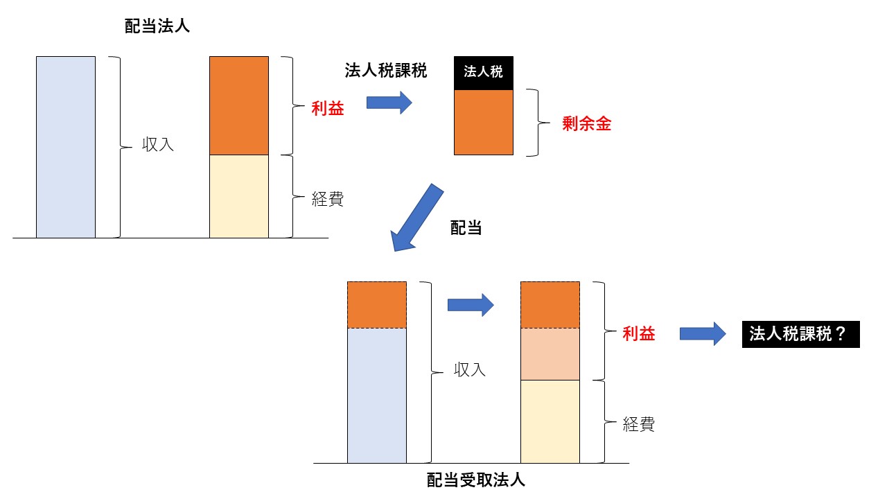 配当は、法人税が課税された後の残った利益(剰余金)から出されるものです。株主である法人は、この課税後の利益の分配を受け取るわけですから、受け取った法人の収益として課税されると、二重課税となるわけです。ですので、これを排除しましょう、ということです。