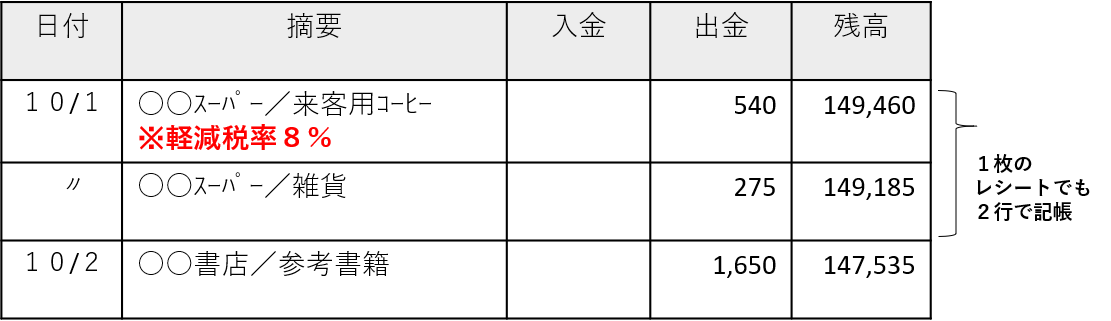 一番注意していただきたい点は、昨年10月以降の記帳ではレシートの「合計額」ではなく「軽減税率8%」と「10%」の区分をしっかり確認いただき、1枚のレシートでも2つの税率がある場合は別々に2行で記帳していただく必要がある、という点です。