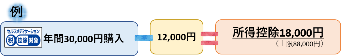 年間のスイッチOTC医薬品の購入金額(上限100,000円)から12,000円を控除した金額と同額の所得控除を受けることができます。(控除金額上限88,000円)
