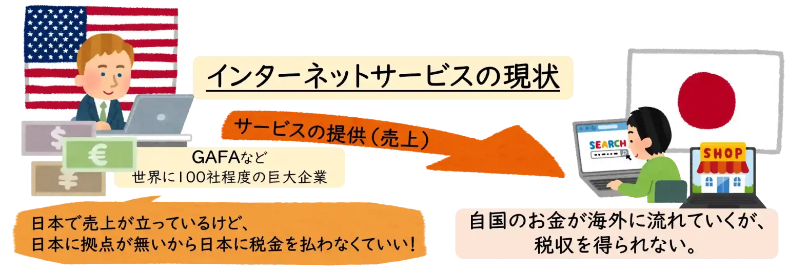 しかしながら、インターネットサービスが普及したことで、日本の消費が活発であっても、その受手は海外の企業で、日本の税金が課せられない、という問題が起こっています。これは世界規模の問題で、欧州をはじめとする約10か国は、独自にデジタルサービス税(DST)を創設し課税を進めてきました。